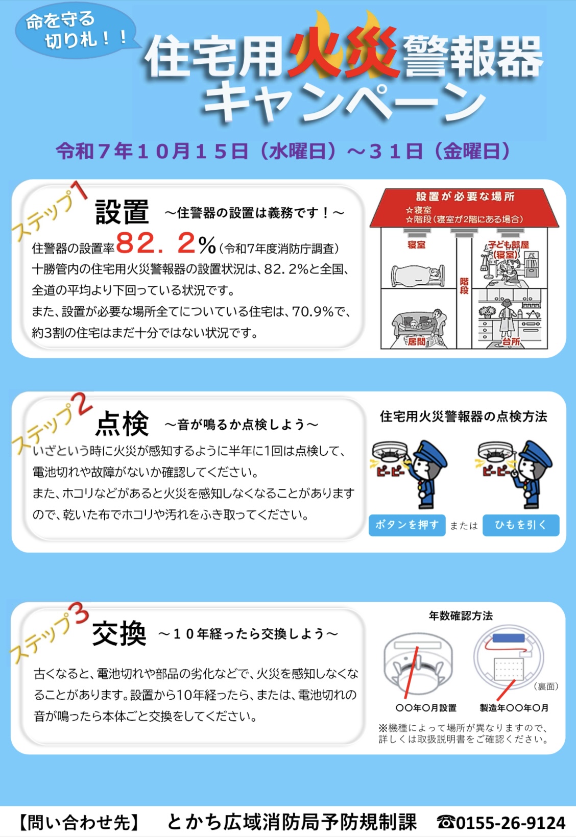 既に設置されているお宅は、「いざ」というときに住宅用火災警報器が適切に作動するよう、キャンペーン期間中に点検を行い、設置後10年を目安に交換しましょう。