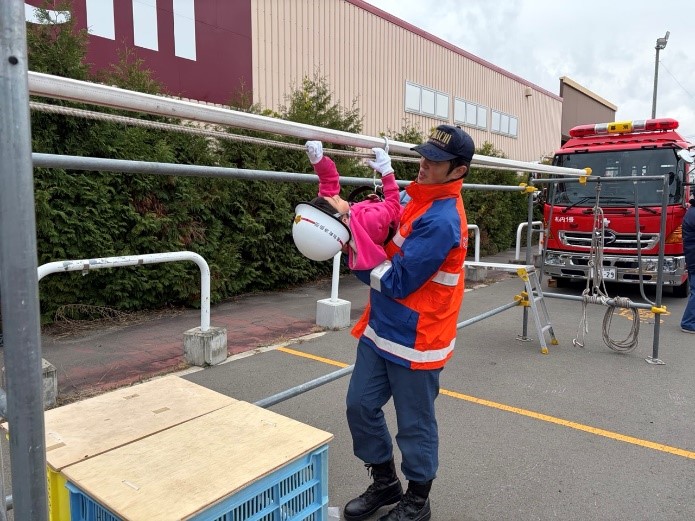 当日は肌寒い気温でしたが、たくさんの子供たちに参加していただき、元気と笑顔にふれあうことができました。イベントでは、子供のロープ渡り体験や消防車乗車体験のほか、住宅用火災警報器に関する広報活動なども行い、大人の方にも多くの関心をもっていただくことができました。また、ダイイチ札内店様のご厚意により、子供たちに景品が配られとても喜んでいただけました。