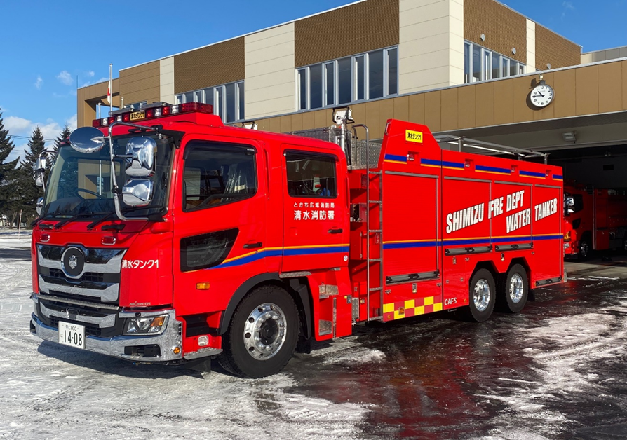 清水消防署では、導入から26年が経過した化学消防自動車を更新し、水槽付消防ポンプ自動車Ⅱ型を導入しました。 新車両の水槽容量は5,000ℓで、照明装置、車両周囲の赤色灯、作業灯をLED化し、車体側面にはバッテンバーグ・マーキングを、車体後部にはシェブロン・マーキングを採用し、視認性と活動時の安全性が向上しました。