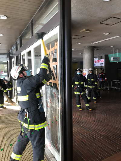 施設を飲食イベント会場にみたて、イベント開催中の火災により多数の負傷者が発生した想定で総合訓練を行ったほか、鉄製ドア、ガラスの破壊訓練等を行いました。大規模な施設を使用できる機会は大変貴重であり、各署隊の連携強化に加え、救助技術の向上に繋がる有意義な訓練となりました。
